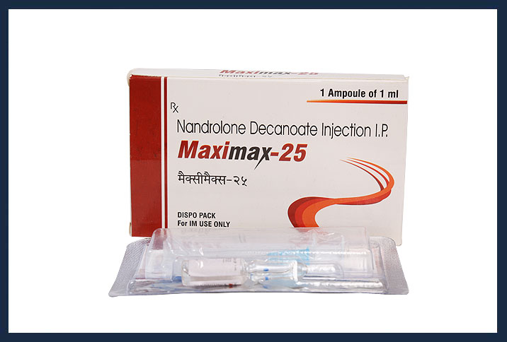MAXIMAX-25 is a brand name for Nandrolone Deconate injection, which comes in a mono cartoon with a syringe. Nandrolone Decanoate Injection is an anabolic steroid used to treat conditions like anemia, muscle-wasting diseases, and osteoporosis. It helps increase red blood cell production, enhance muscle mass, and improve bone density under medical supervision.